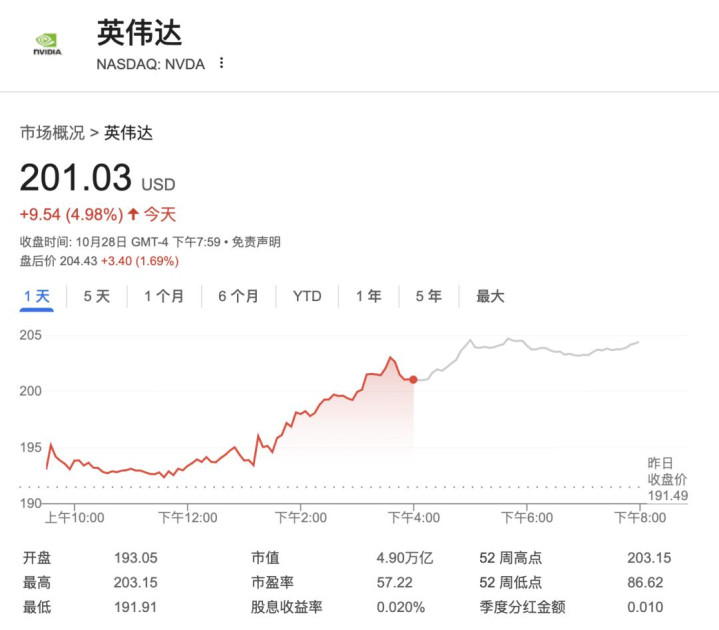 尽管在各个领域都面临竞争,但市场投资者还是选择看好英伟达——收盘时,英伟达股价上涨4.98%,达到201.03美元每股,盘后价格更是达到每股204.43美元,创下了历史新高。