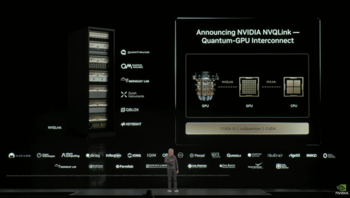 这次演讲中,NVIDIA发布了NVQLink,这是一种新的互连架构,可以直接连接量子处理器(QPUs)和NVIDIA GPU,首次实现了AI超算与量子处理器的无缝连接。